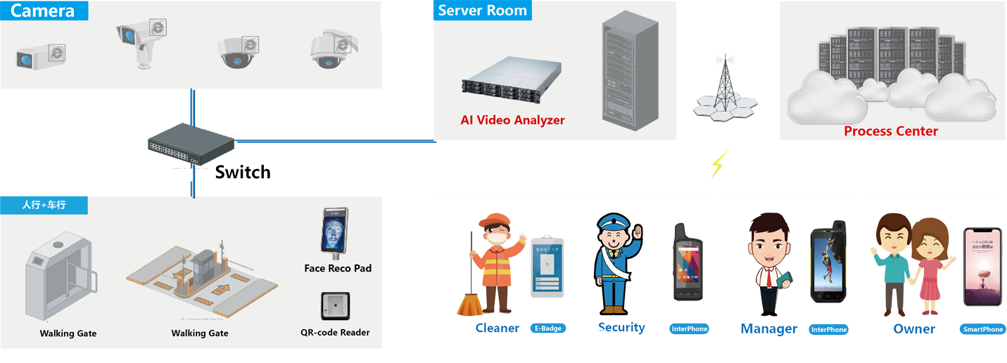 This solution realizes the intelligent upgrade of park security and park management applications through the loading of AI technology, and improves the park security level and management efficiency. Extend the application nerve of the Internet of Things to various business scenarios in the park, realize the online integration and calculation of data information of people, vehicles and things, and provide data sources for the intelligent management of the park. Help the park to improve the security level, improve work efficiency, and reduce management costs.