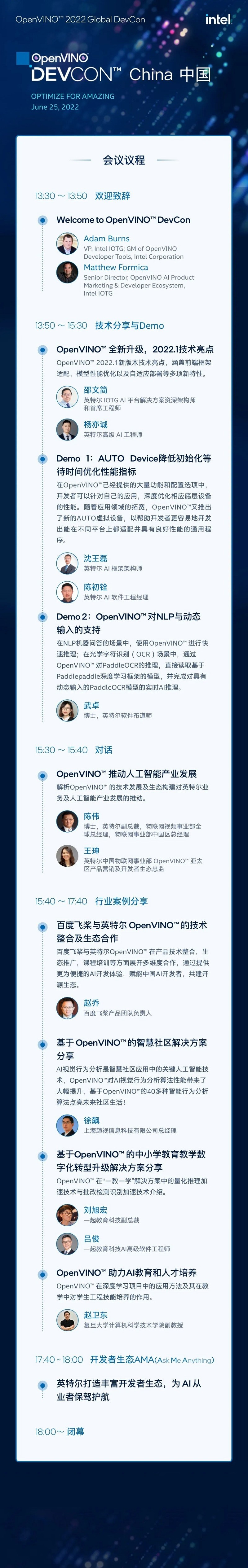 2022 OpenVINO? DevCon·中國站將在萬眾矚目下于2022年6月25日以線上峰會的形式“登陸”上海。這場全球性的 OpenVINO? 開發者盛會,將由 OpenVINO? 核心技術專家分享最新的產品信息和技術演示,同時邀請行業與教育領域具有影響力的多家企業共同參與,邀請多位大咖進行行業洞見、技術分享、案例展示等多維度的分享與交流,幫助開發者在提升技術的同時,拓寬職業視野,了解行業趨勢。