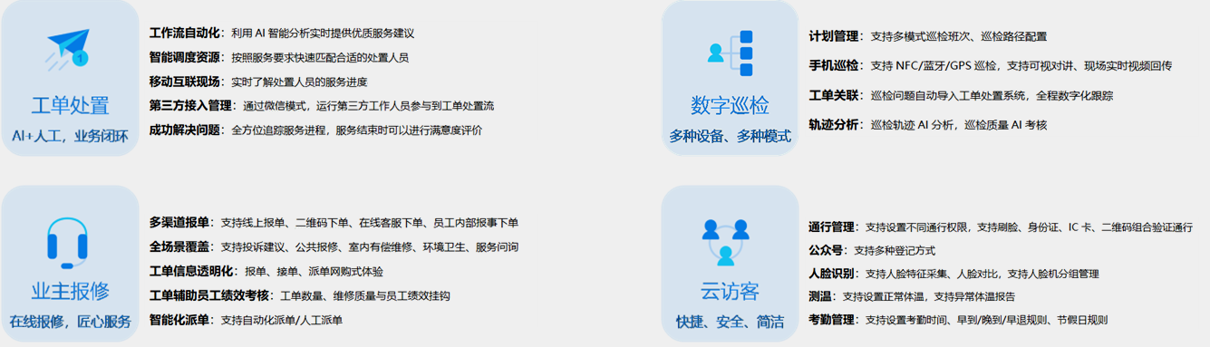 本方案通過(guò)AI技術(shù)的加載實(shí)現(xiàn)園區(qū)安防與園區(qū)管理應(yīng)用的智慧化升級(jí),提升園區(qū)安全等級(jí)和管理效率。將物聯(lián)網(wǎng)應(yīng)用神經(jīng)延伸至園區(qū)各種業(yè)務(wù)場(chǎng)景,實(shí)現(xiàn)人、車(chē)、物數(shù)據(jù)信息線(xiàn)上融合與計(jì)算,為園區(qū)智慧化管理提供數(shù)據(jù)源。助力園區(qū)實(shí)現(xiàn)安全等級(jí)提升、工作效率提升、管理成本下降。